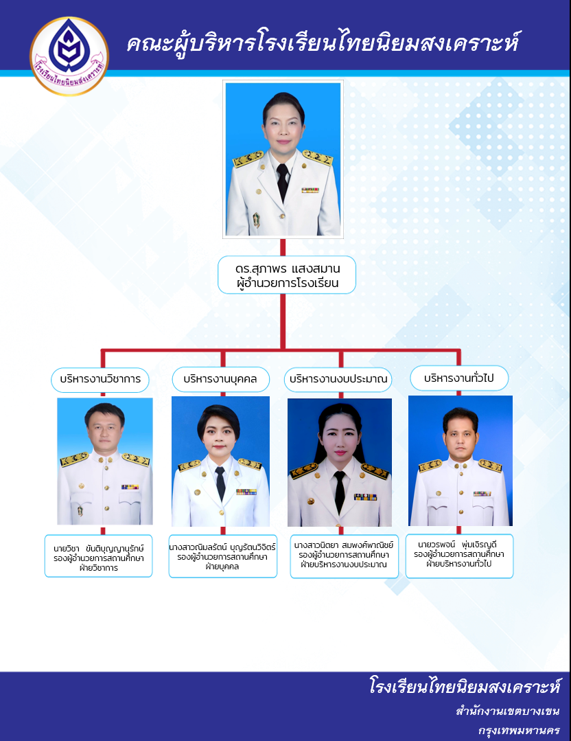 ข้าพระพุทธเจ้าคณะผู้บริหาร ครู นักเรียน ผู้ปกครอง และบุคลากรทุกหมู่เหล่า โรงเรียนไทยนิยมสงเคราะห์ สำนักงานเขตบางเขน กรุงเทพมหานคร